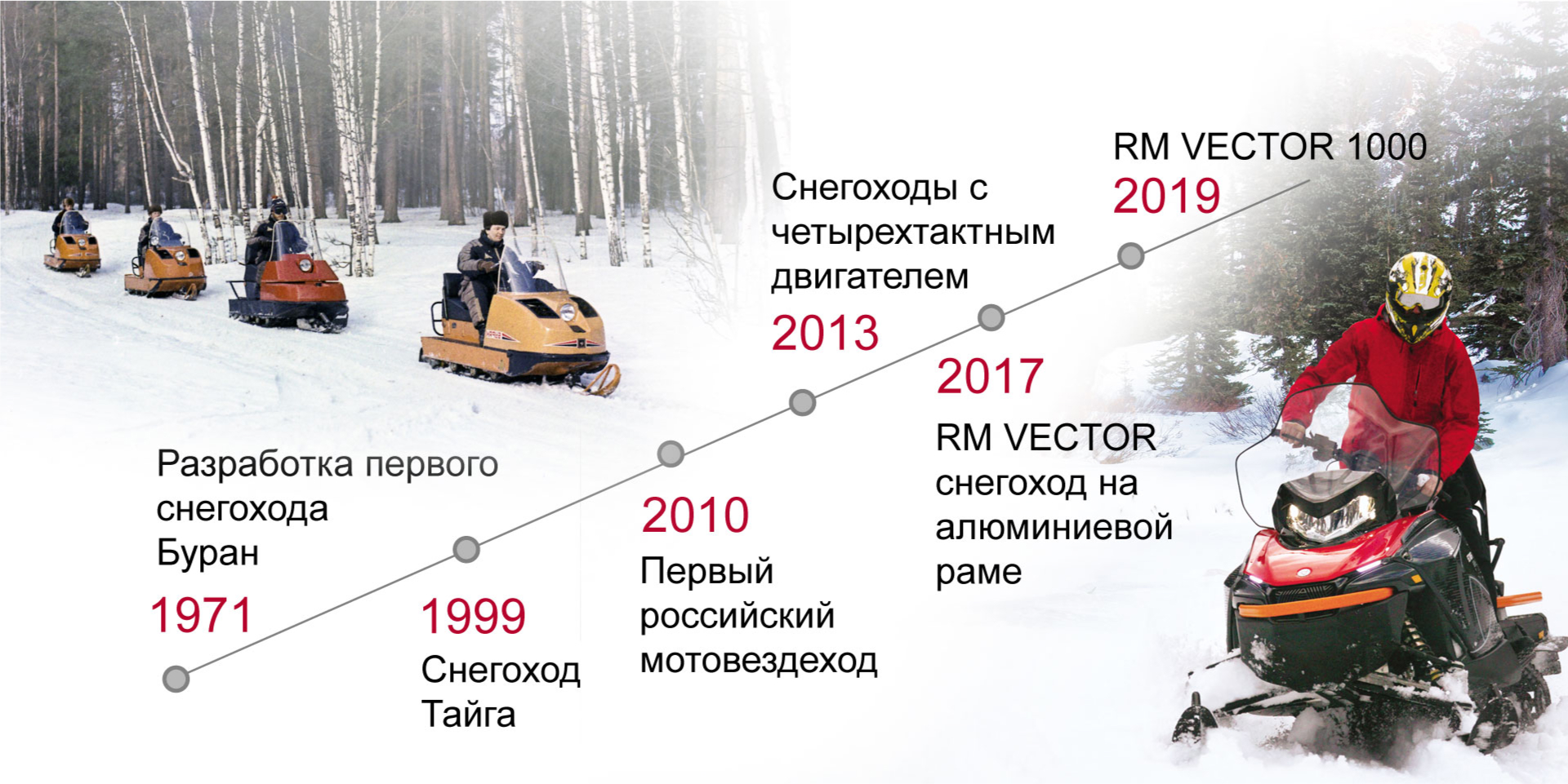 История деятельности компании «Русская механика» исчисляется с 1971 года: от создания первого в стране снегохода «Буран» до разработки и производства мотовездеходов РМ и нового семейства снегоходов на алюминиевой платформе «Vector».