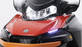 Снегоход энергономичен: перед поездкой можно легко отрегулировать высоту руля и жесткость подвески. Тепла и комфорта добавят подогрев рукояток и курка газа, розетки для обогрева визеров на шлемах водителя и пассажира. Ручки для пассажира оснащены ветро-защитой и подогревом. Возможность за счет съемного модульного сидения увеличить багажное пространство. Приборная панель оптимально информативна для дальней поездки — все это делает «Фронтьер 1000» идеальным снежным крузером.